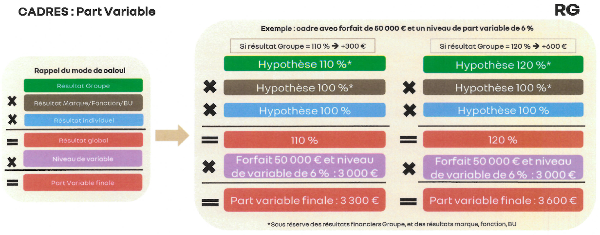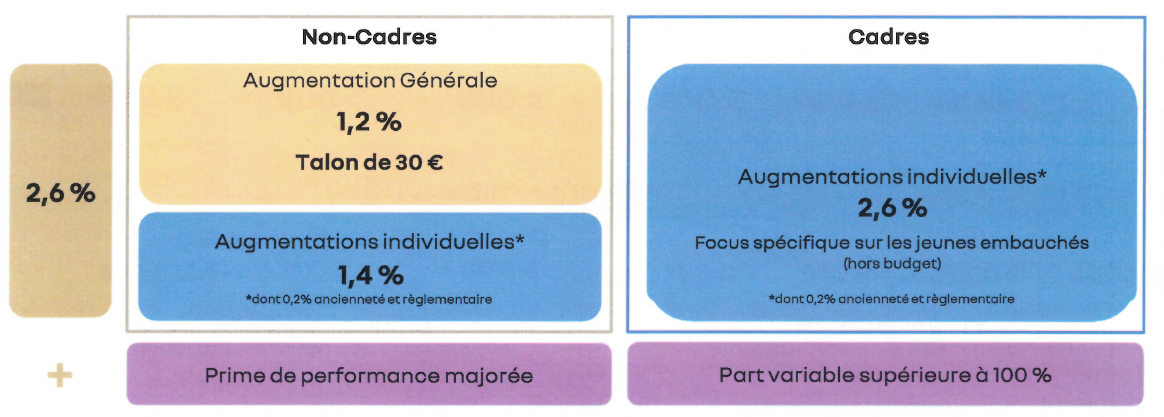 « Au vu de la bonne performance du groupe en 2024 », la direction ajoute royalement 100 € de plus sur la prime individuelle des salariés non-cadres... mais 30 % des salariés non-cadres n’auront pas de prime. Et elle majore de 10 % ou 20 % la part variable des Cadres.