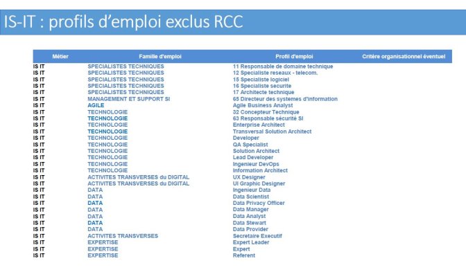 - L’affectation gris/bleu des profils d’emploi est figée le temps de la mise en œuvre de la RCC