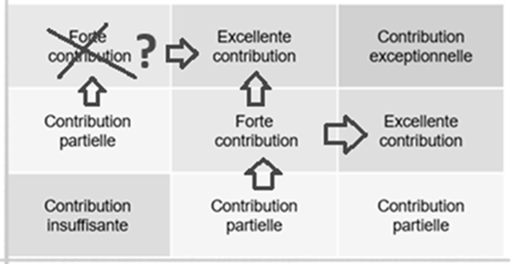 La « Forte contribution » est une évaluation très positive, c’est un bon résultat, cela indique une atteinte des objectifs à la fois en termes de résultats, de comportement et de How, de manière d’atteindre les résultats.