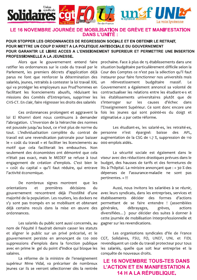 Les organisations Solidaires, CGT, FO, FSU, UNEF, UNL d’Île-de-France appellent à faire grève le 16/11 :