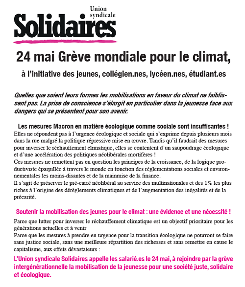 L’Union syndicale Solidaires appelle les salariés le 24 mai à rejoindre par la grève intergénérationnelle la mobilisation de la jeunesse pour une société juste, solidaire et écologique.
