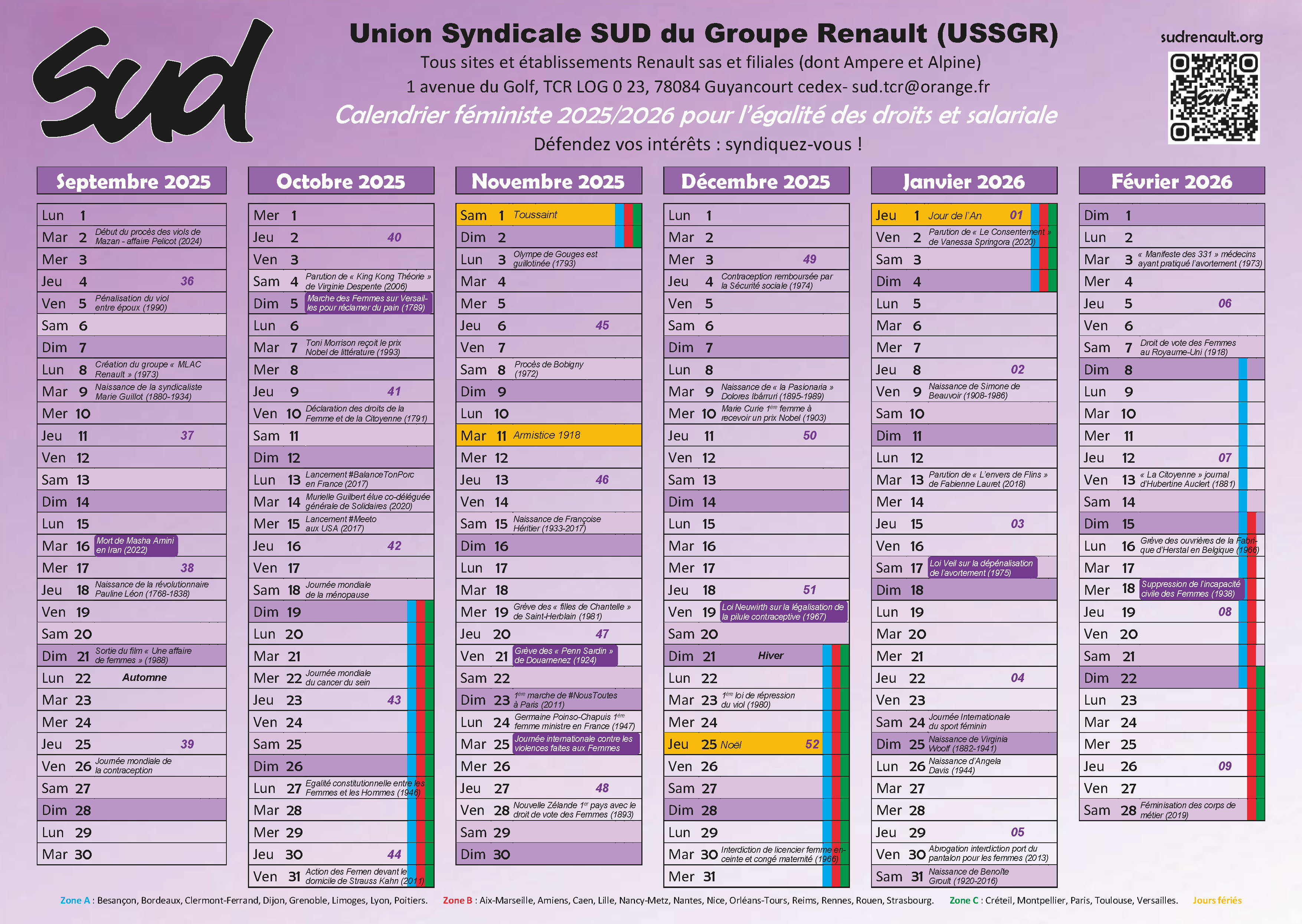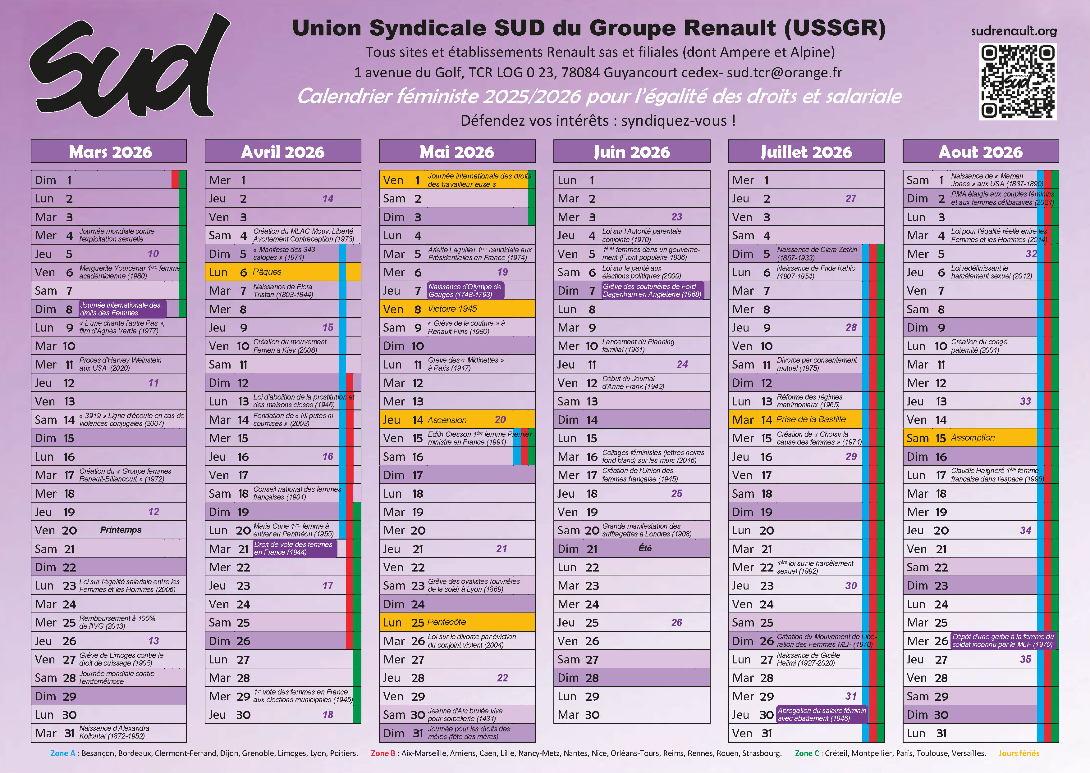 Après le calendrier de l’histoire sociale en France et chez Renault l’an dernier, les calendriers SUD Renault 2025-2026 ont pour thème le combat pour l’égalité des droits et salariale entre les femmes et les hommes. Pratiques et instructifs, vous pouvez vous en procurer auprès de nos militants.