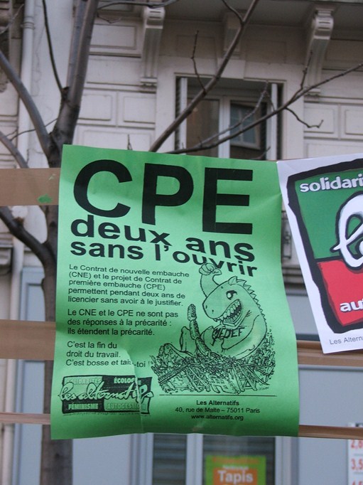 Le contrat première embauche (CPE) était un type de contrat de travail à durée indéterminée à destination des moins de 26 ans qui n’a finalement pas vu le jour. La vive opposition au projet (grèves, manifestations...) a fait reculer le pouvoir exécutif alors sous la présidence de Jacques Chirac.